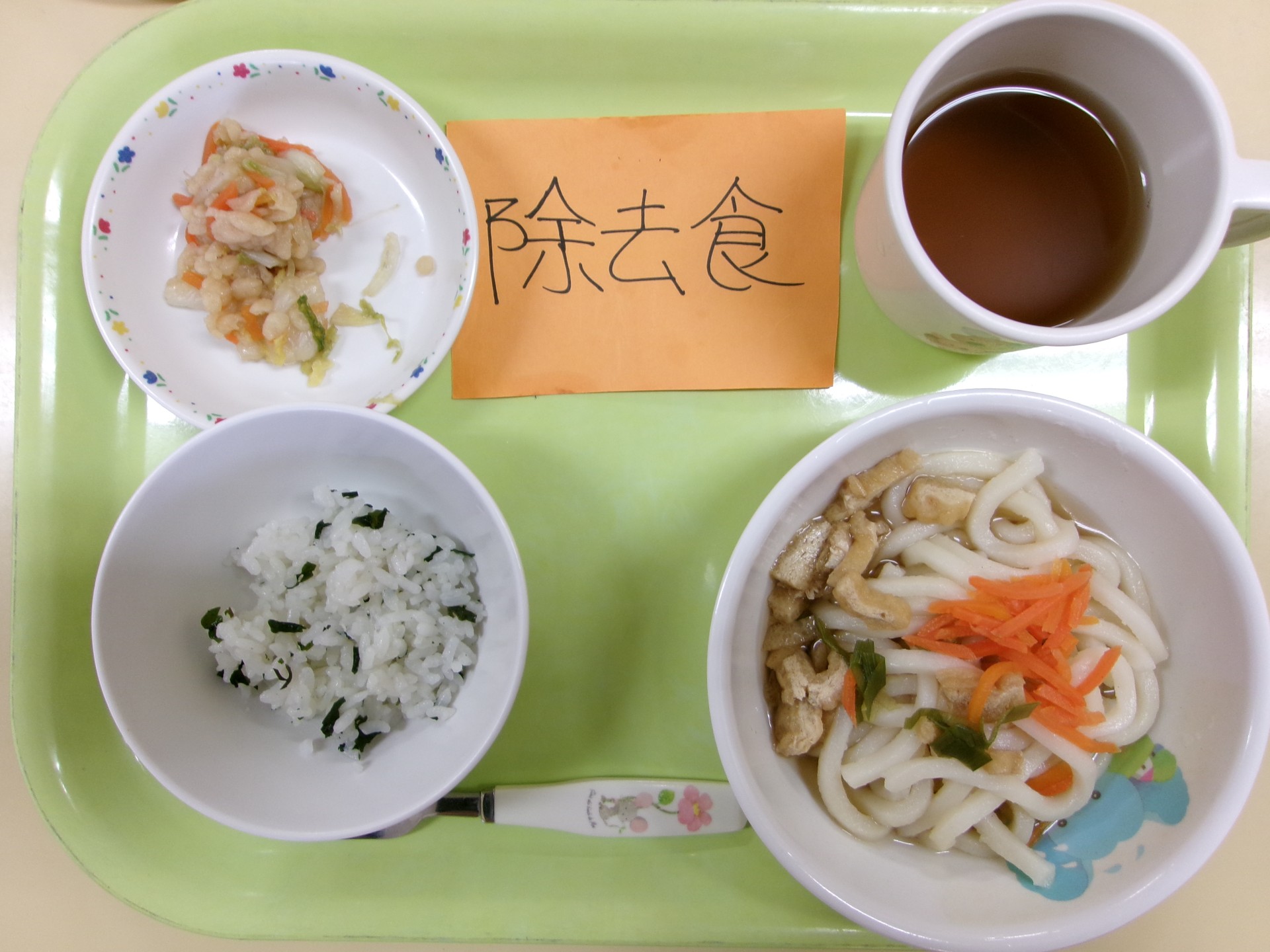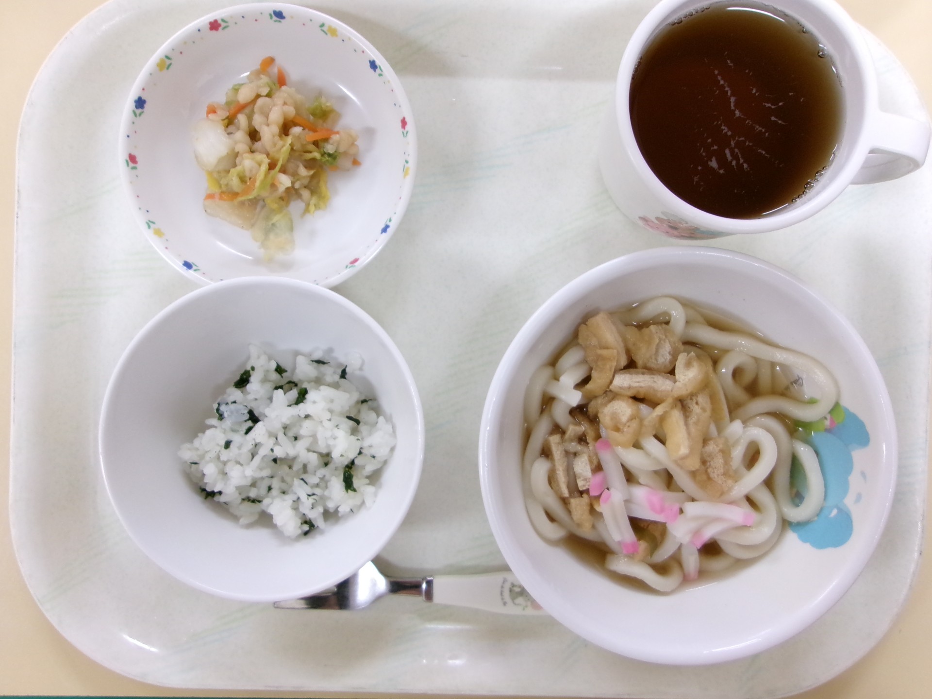 今日の給食をお知らせします。 〇わかめご飯 〇きつねうどん 〇白菜のたぬき和え