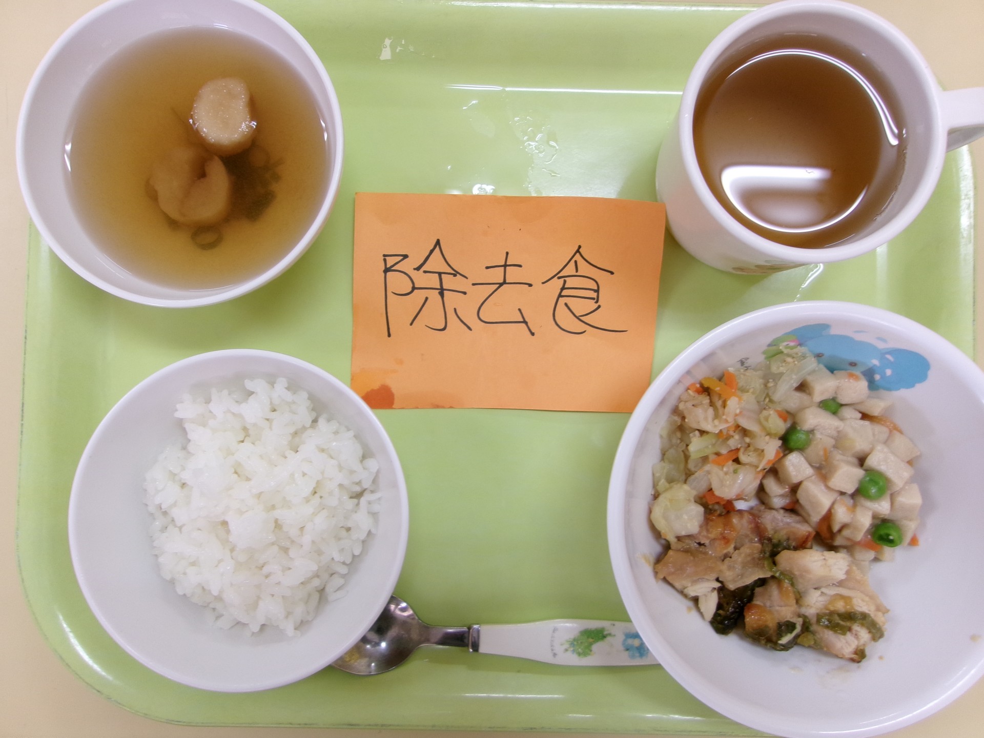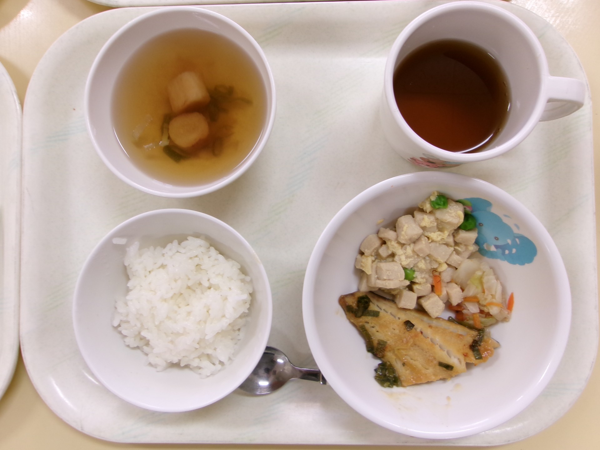 今日の給食をお知らせします。 〇ご飯 〇タラのネギ味噌焼き 〇高野豆腐の卵とじ 〇清汁(麩)