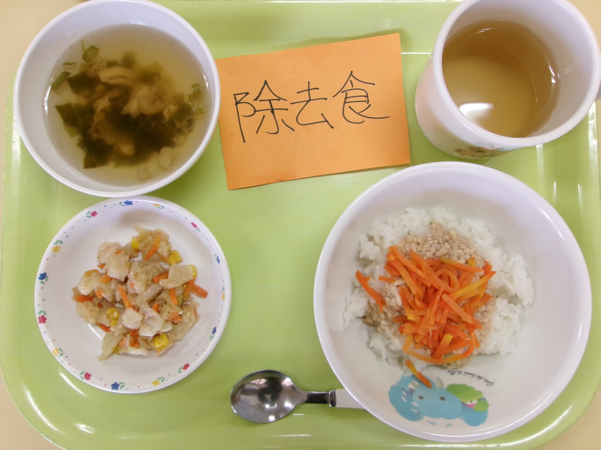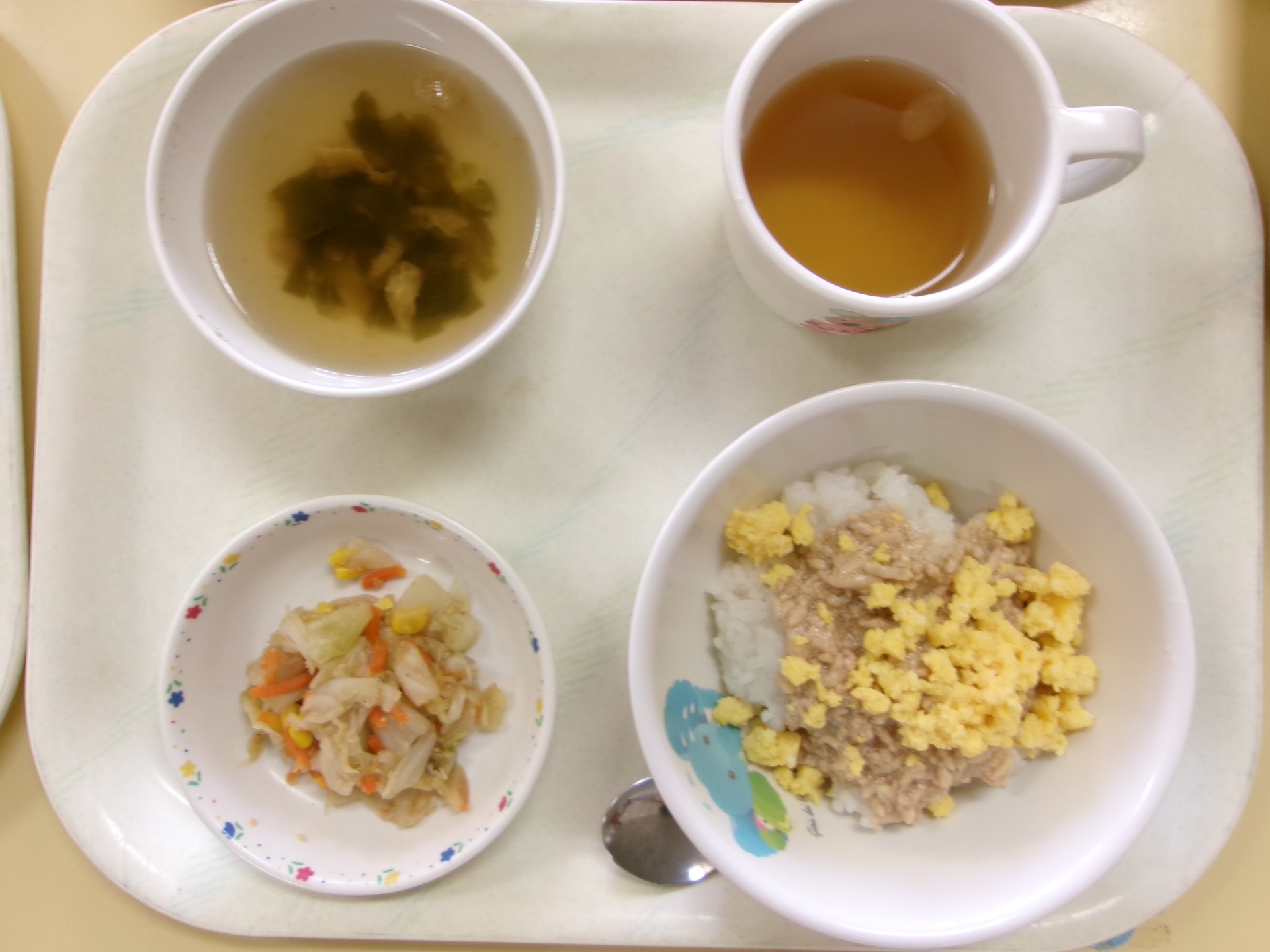 今日の給食をお知らせします。 〇二色丼 〇キャベツとコーンのごま和え 〇清汁(わかめ・油揚げ)