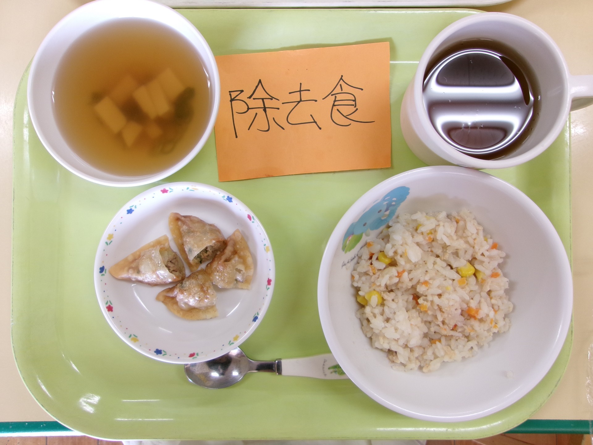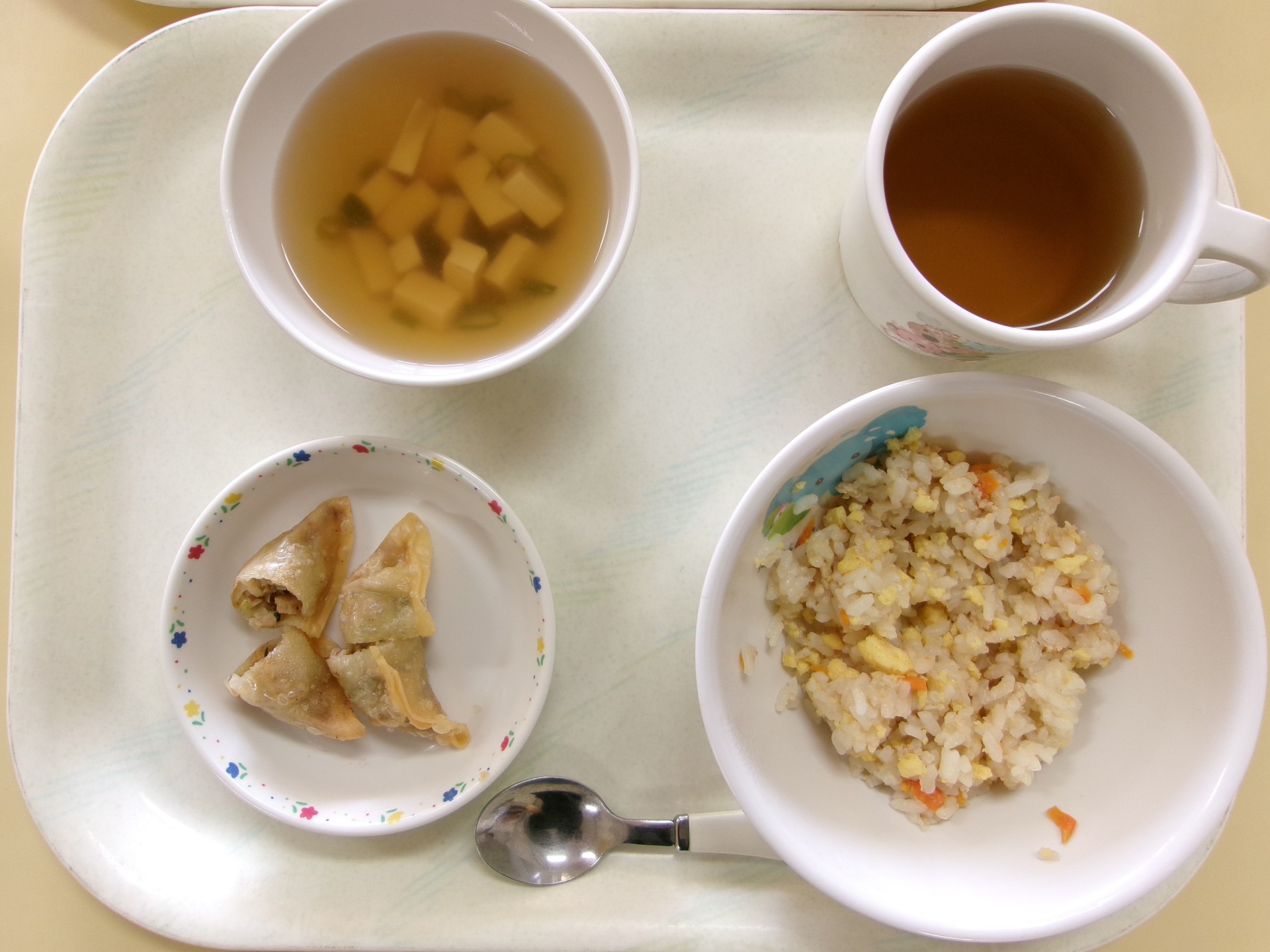 今日の給食をお知らせします。 〇チャーハン 〇揚げ餃子 〇中華スープ(豆腐)